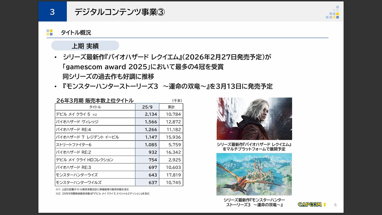 デジタルコンテンツ事業では、「デビル メイ クライ 5」が好調。シリーズ最新作『バイオハザードレクイエム』の発売に向けたものか同シリーズの過去作も好調。6月のNintendo Switch2への移植販売に加え、eスポーツ展開との連携などにより「ストリートファイター6」も伸びています。